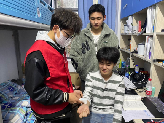 青协卢鸿儒同学在学生里招募志愿者时说道:“疫情期间,校园防护需要每一位同学共同努力!”学院把党员先锋示范岗设立在办公楼下,严格落实体温检测、消毒杀菌的进入措施,成为了学生党员踊跃报名的新“焦点”。