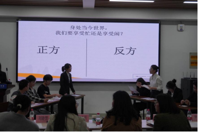 联合外国语学院在教一401教室开展了“吾口辩吾心”主题辩论赛半决赛。本次双方各派出两支队伍,就辩题“幸福感是通过物质追求还是精神满足实现的”、“在当下世界,是享受闲还是享受忙”展开激烈辩论。辩论赛邀请到双方学院心理站站长等作为评委,百余位同学现场观赛。