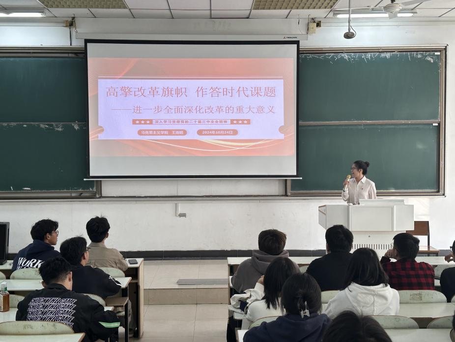 于10月24日在教三南201举行了党的二十届三中全会精神专题宣讲会。本次宣讲会由大学生宣讲团的王雨晴、李锐城、胡晓冬等三位成员主讲,学院全体学生骨干参会。