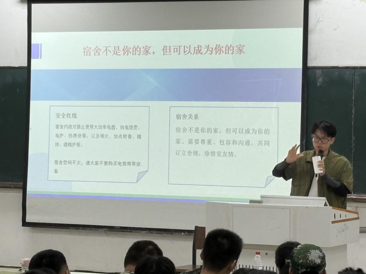 辅导员黄乐远从适应大学生活的角度出发,为新生们梳理了入学阶段需注意的关键事项,涵盖学习规划、心理调适、人际交往等方面,助力同学们顺利开启大学新篇章。随后,辅导员赵杨就本次军训的具体安排、作息制度、纪律要求等作了详细说明,并提醒同学们注意自我防护、积极融入集体,以饱满的精神状态完成训练任务。