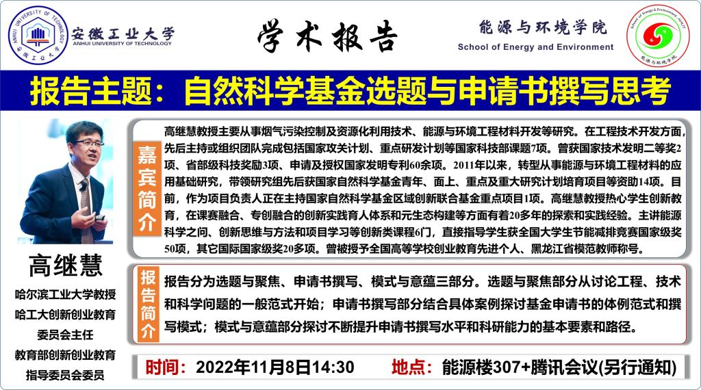 报告人介绍:高继慧教授主要从事烟气污染控制及资源化利用技术、能源与环境工程材料开发等研究。在工程技术开发方面,先后主持或组织团队完成包括国家攻关计划、重点研发计划等国家科技部课题7项。曾获国家技术发明二等奖2项、省部级科技奖励3项、申请及授权国家发明专利60余项。2011年以来,转型从事能源与环境工程材料的应用基础研究,带领研究组先后获国家自然科学基金青年、面上、重点及重大研究计划培育项目等资助14项。目前,作为项目负责人正在主持国家自然科学基金区域创新联合基金重点项目1项。