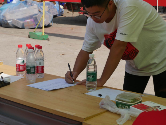 志愿者们搬运物资,布置好活动场地;活动期间,志愿者们分工合作,有的整理军训服,有的帮助登记学生姓名、学号等信息。有条不紊的进行军训服回收活动。